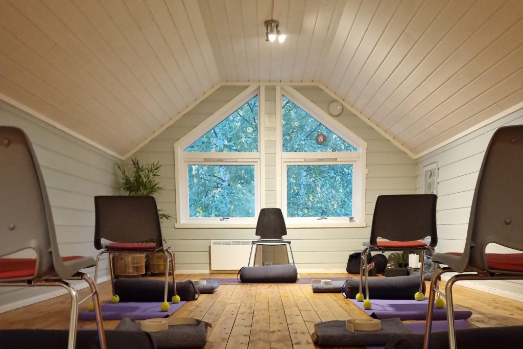 Jeg har i samarbeid med Grue Revmatikerforening stolyoga for foreningensmedlemmer samt andre som skulle ønske å være med. Vi bruker stol som en naturlig del av yogapraksisen. Vi bruker også bolstere, rem, tepper og klosser der vi trenger det.
